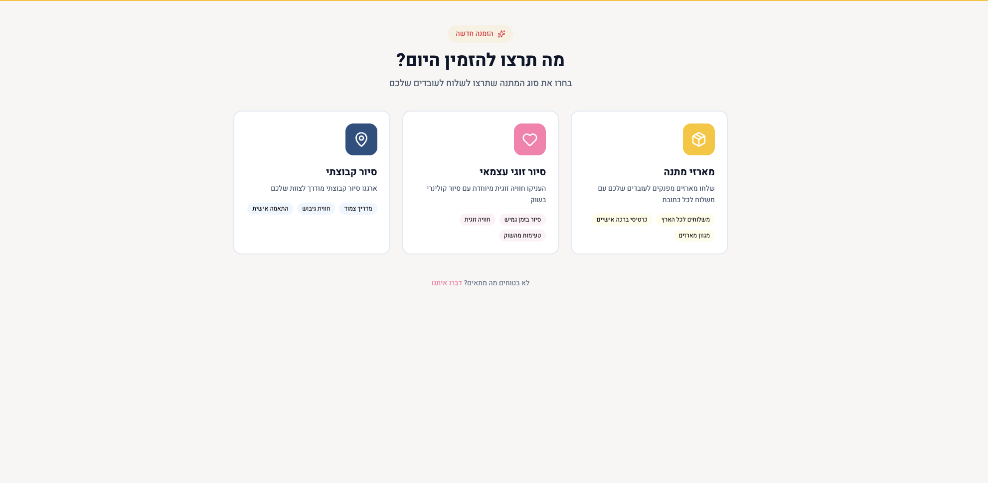 A personalized gift website that allows every employee in the company to choose the perfect gift for them. The unique service we offer our business customers includes setting up and building an interactive platform, in line with the story and values that reflect the company's identity. We offer a wide range of great gifts, including pampering gift packages, culinary tours for couples or groups, and a variety of other unique experiences. All gifts are tailored to the organization's budget and values. We provide comprehensive care and coverage from A to Z: characterization and construction of a customized website, definition of categories according to budget or rank, an efficient delivery system to every corner (including Rosh Pina), and of course, availability, response, and dedicated and attentive customer service at all times. After a significant number of (very!) successful projects in the past, we can cautiously conclude that turning the gift selection process into an exciting and satisfying experience, one that can strengthen the bond between employees and the company and between employees and their families, is not out of reach. At most, it's as high as a giraffe. We invite you to join us on a journey of freedom, creativity, and giving, during which we will create a unique and original gift experience for your organization.