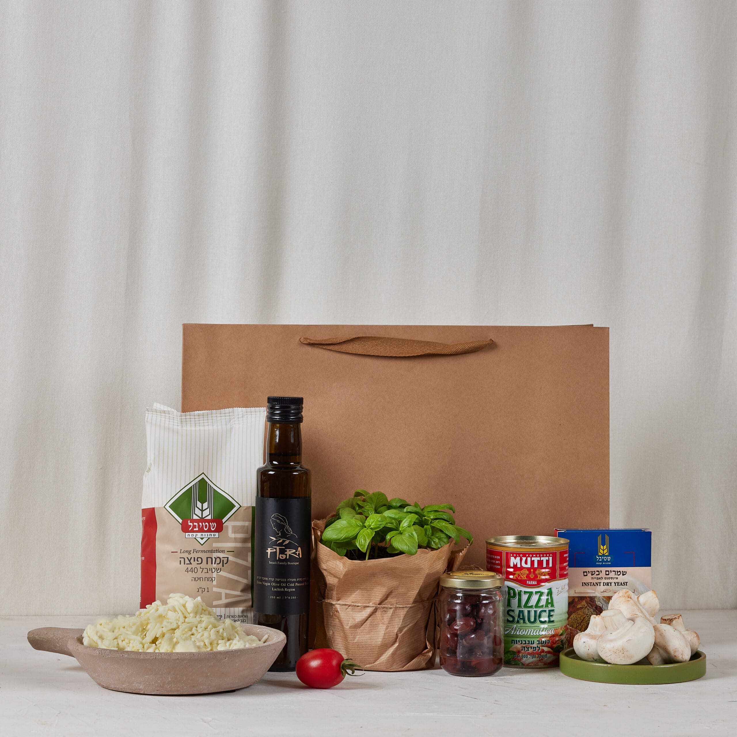 כל מה שצריך לפיצה + מתכון סודי שאנחנו מוכנים לגלות בשביל שתהפכו לפציולו לערב אחד. המארז מגיע בשקית קרטון עבה עם אופציה למיתוג ע״י מדבקה