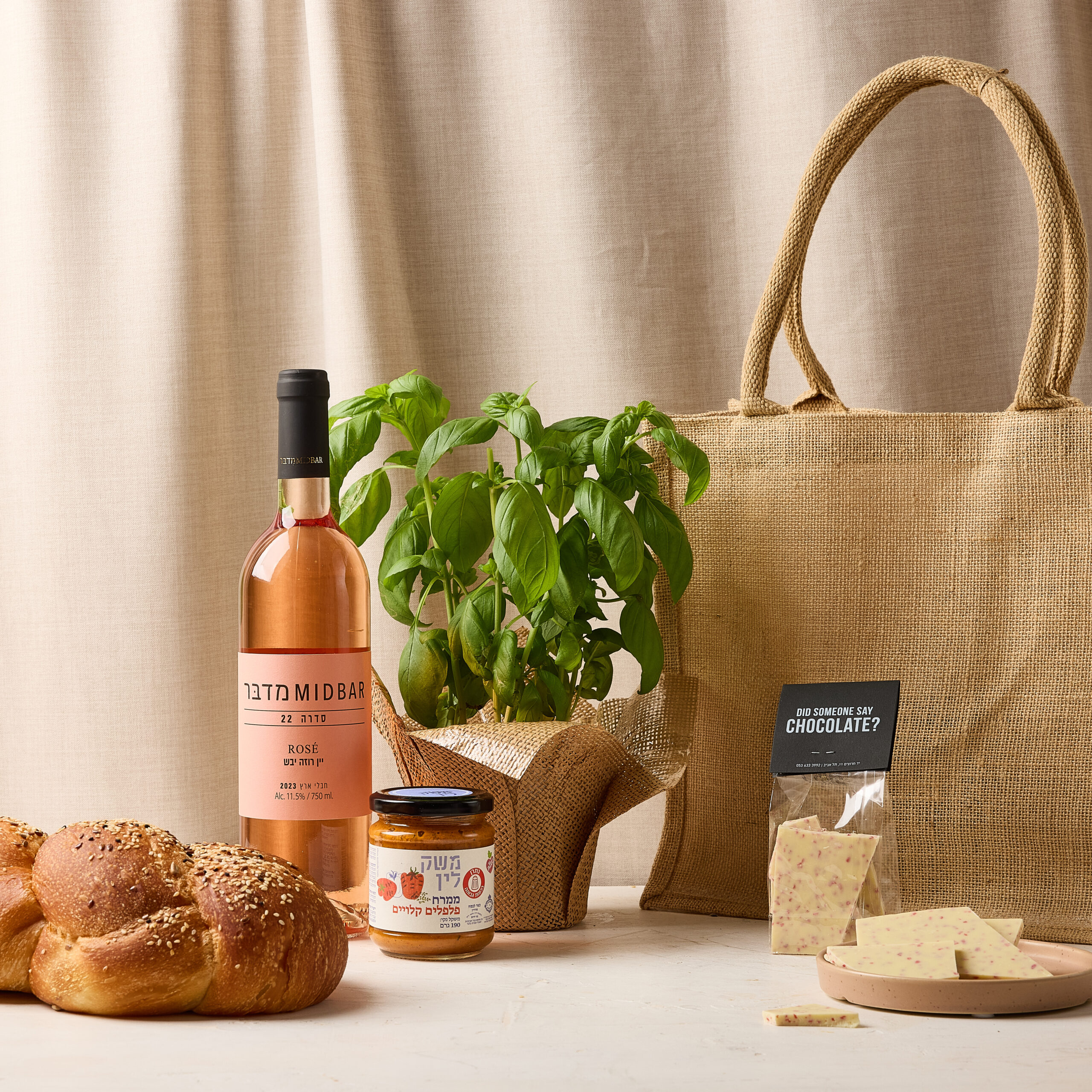 מארז מושלם לסופ״ש. חלה, יין ושוקולד – מה צריך יותר? לצד עציץ תבלין, ממרח מושלם ומגוון אופציות לשדרוג –
